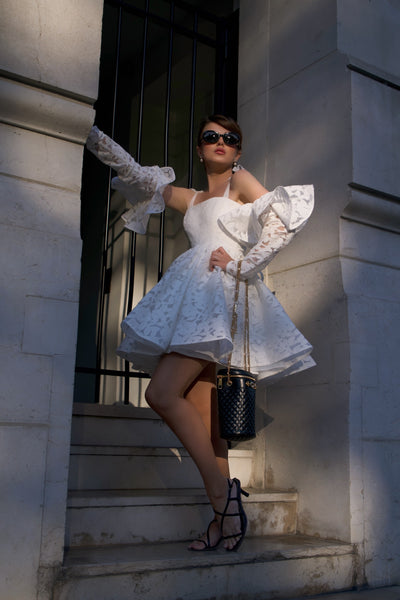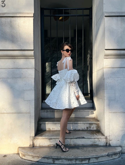 Introducing the Camille Dress: a stunning short wedding dress crafted from luxurious jacquard fabric, featuring a beautiful flower pattern that adds a touch of romance and elegance. This dress is designed for versatility and style, with detachable sleeves that can be easily removed or attached using buttons. This allows you to customize your look throughout the day, making it perfect for transitioning from ceremony to reception.
