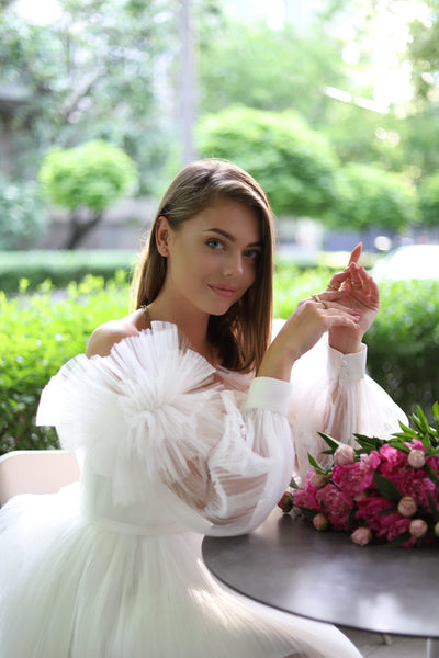 The Patty Dress is more than just a wedding dress; it's a celebration of style, grace, and individuality. Embrace the beauty of this dress and let it be a part of your unforgettable wedding journey. Experience the luxury of finely crafted tulle, the charm of detachable sleeves, and the sophistication of a lace-up back with the Patty Dress.