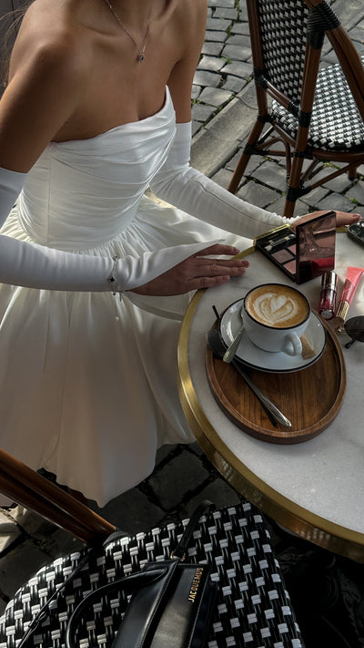 This short wedding dress features a romantic balloon skirt and a beautifully hand-draped satin corset. The back is finished with a lace-up closure, allowing for easy size adjustments and a perfect fit.