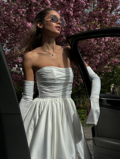 Made from high-quality satin, the dress combines structure and softness, while the airy balloon-style skirt adds playful volume. A unique and practical touch—stylish hidden pockets—adds comfort and charm to the design.
