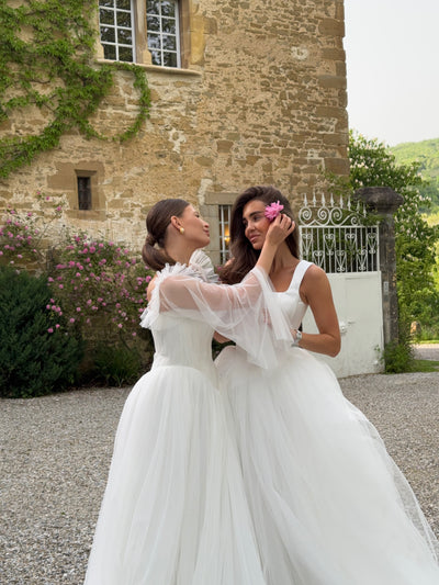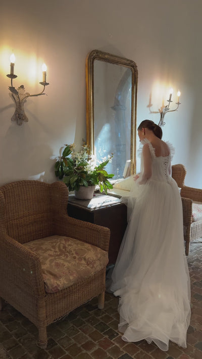 A romantic wedding gown made from ultra-soft tulle, featuring a hand-draped bodice with delicate ruffle details and a basque waist. Long sheer sleeves and a flowing tulle scarf add an ethereal touch, while the lace-up back and light train complete the look with elegance and ease.