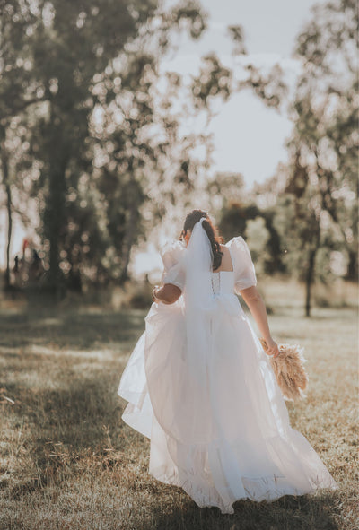This long wedding dress with puffed sleeves and a ruffled skirt for a romantic look. With a lace-up back for a tailored fit, the standout detail is the statement bow at the back.
