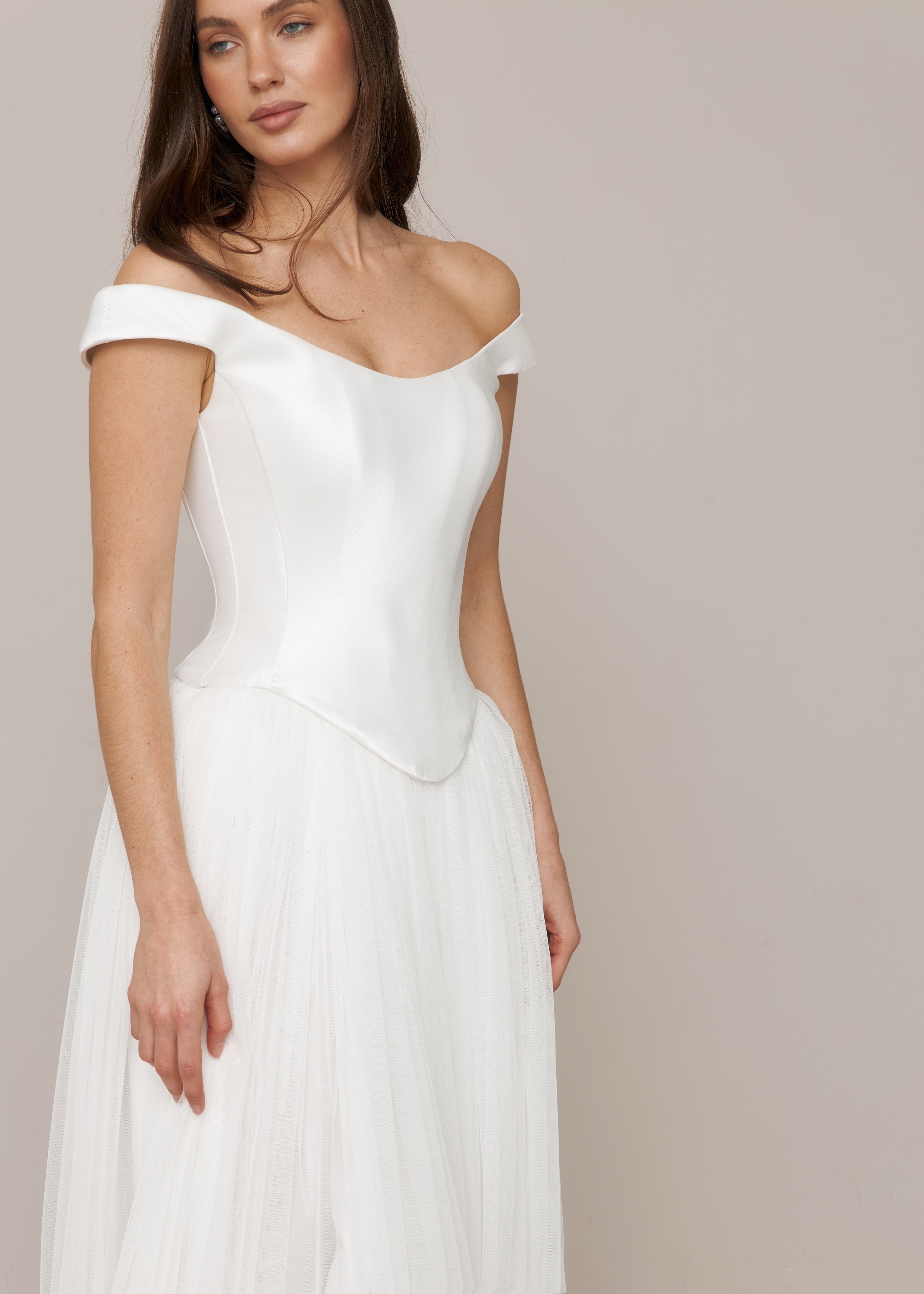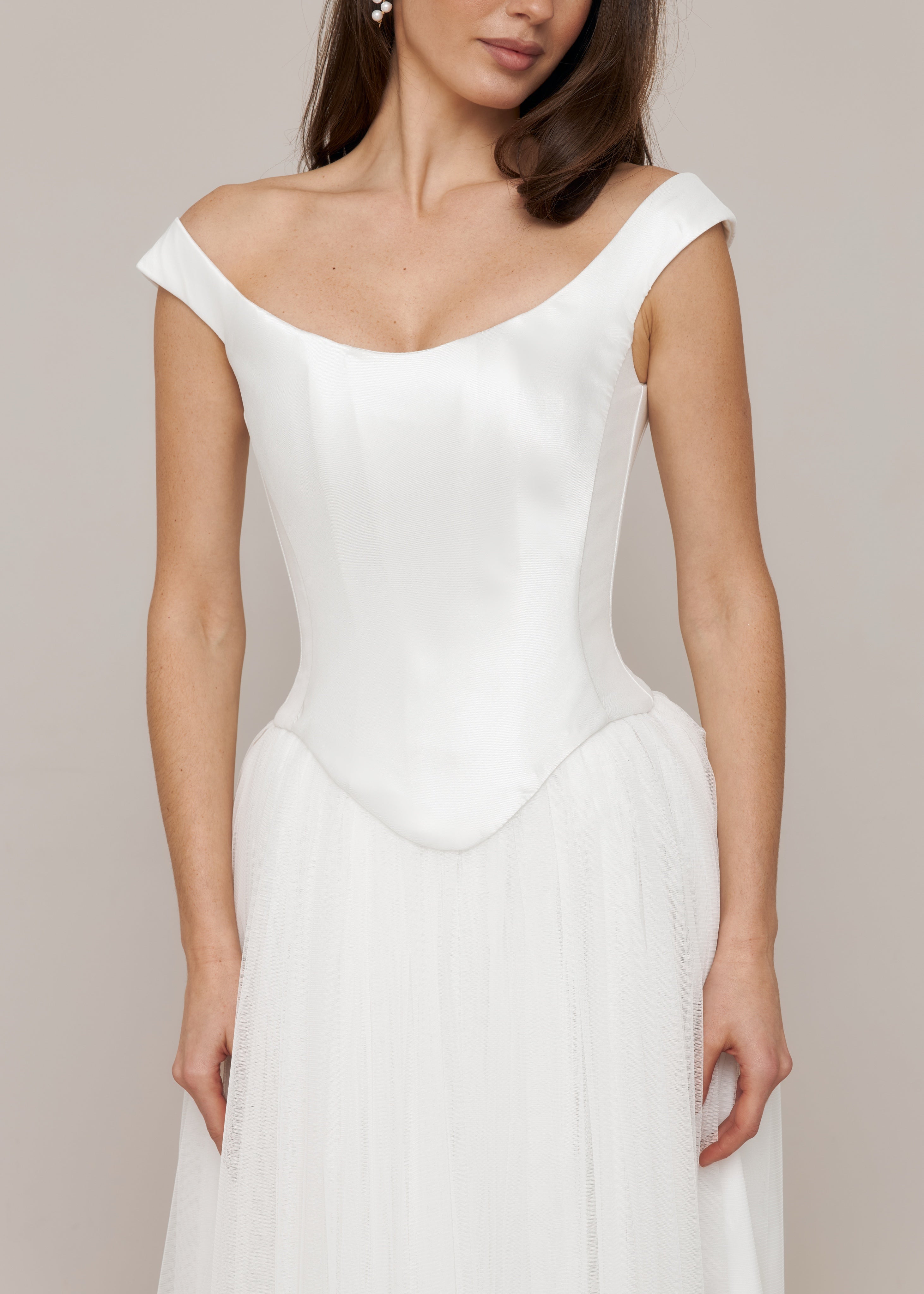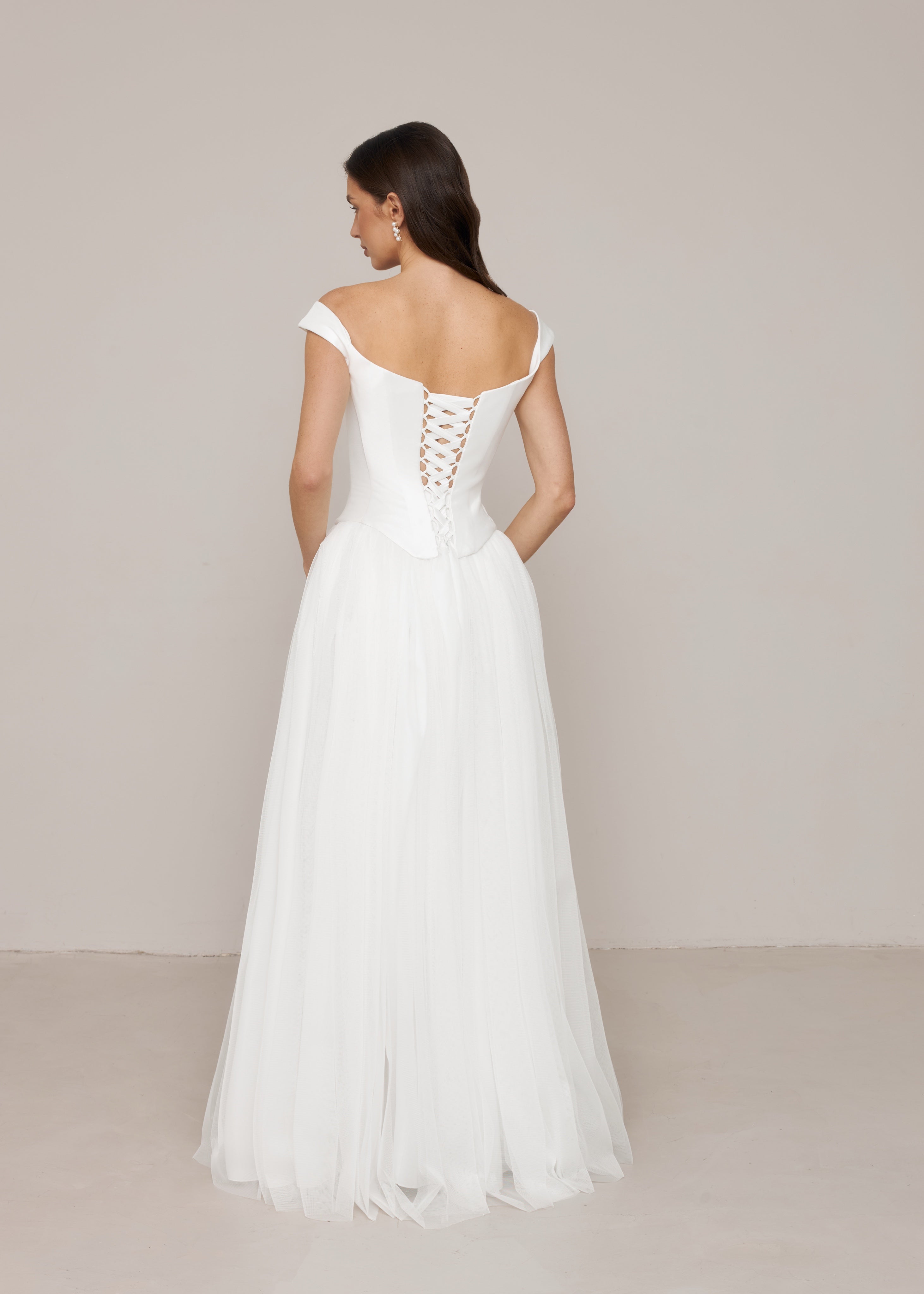 The long skirt is made from soft, lightweight tulle, adding movement and airiness while balancing the structured mikado corset.