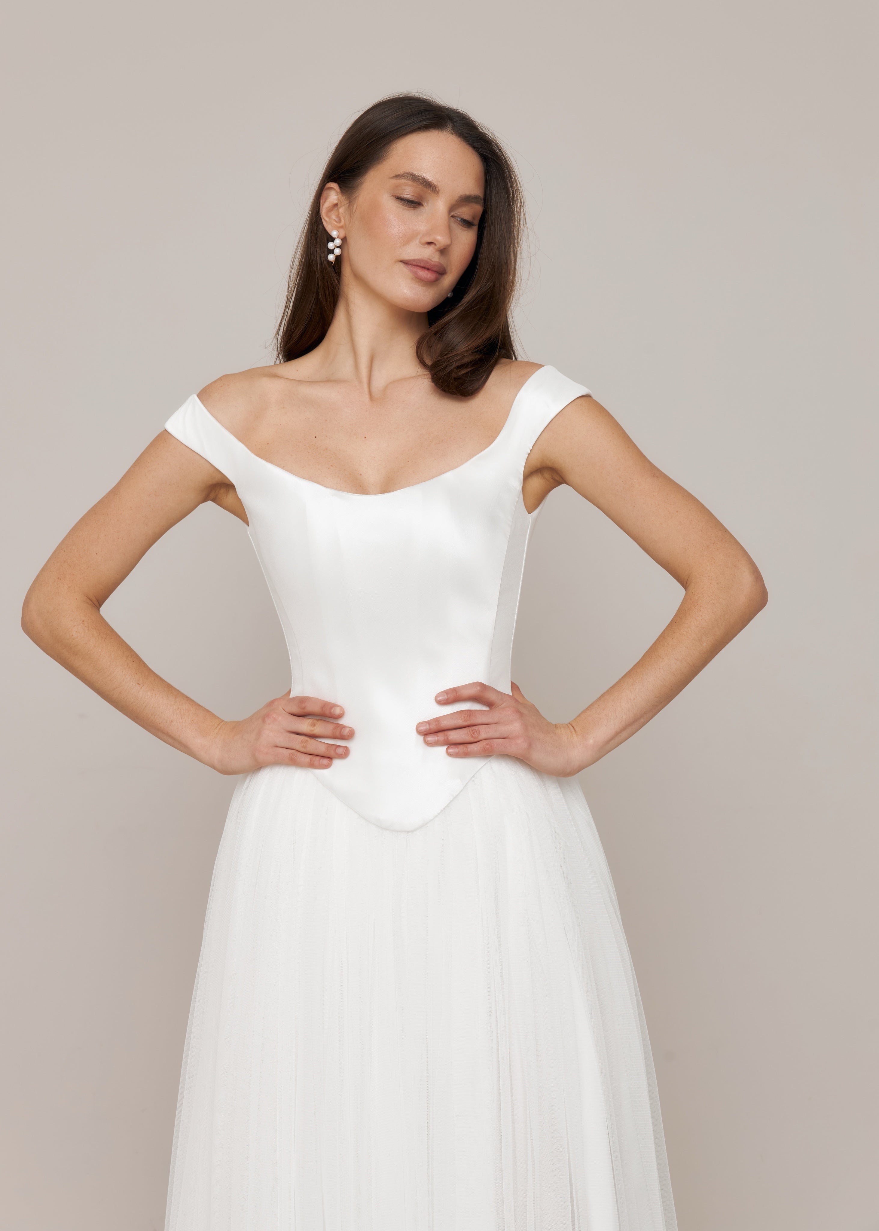 The corset is crafted from high-quality mikado fabric and designed to sculpt the waist beautifully. It features built-in boning, integrated cups for support, and a lace-up back, allowing for a precise, adjustable fit. The off-shoulder neckline softly highlights the shoulders and décolletage, while the basque waistline elongates the torso and enhances the feminine, vintage-style shape.