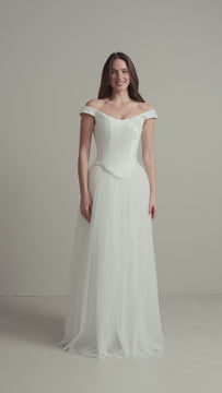 This elegant bridal set features a structured mikado corset with a basque waist, paired with a flowing soft tulle skirt, creating a timeless vintage-inspired silhouette.