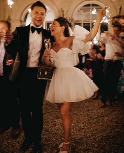 Let's break it down: This short wedding dress is all about bringing fun and flair to the bridal world. With sleeves that offer a chic nod to sophistication, a sweetheart neckline that frames your smile, and a puffy mini skirt that's begging for a spin on the dance floor, the Karen Gown is your go-to for making a statement.