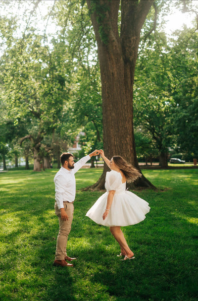 This short wedding dress is made of light organza with airy puff sleeves and a fitted lace-up bodice. The highlight of the design is the hand-applied pearl embellishment, added with care in our studio to create a soft, romantic glow. It’s a perfect choice for modern brides, Civil wedding, elopement, second bridal look, bridal party.