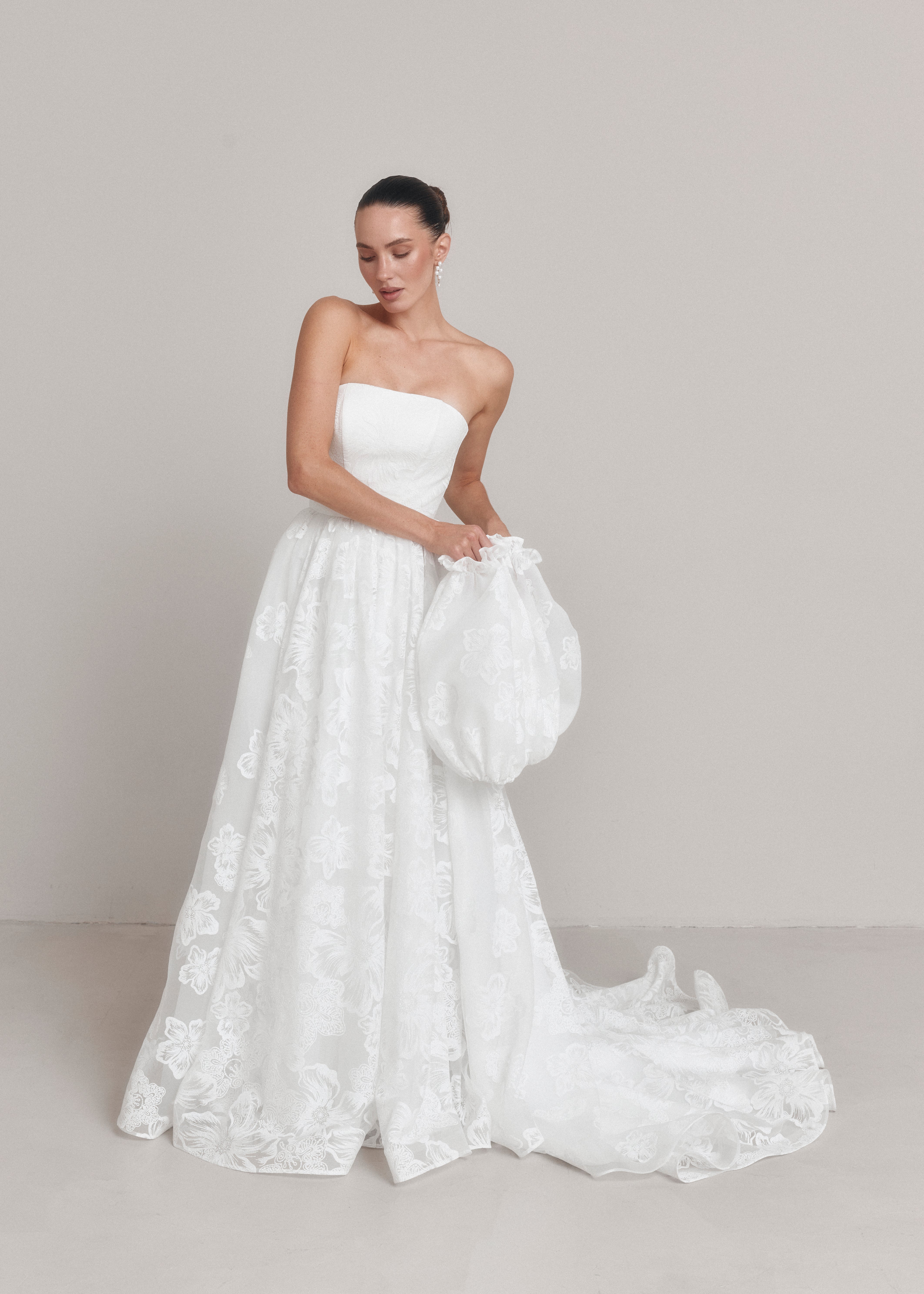 Crafted from the lightest organza, the Annabelle Dress floats around you like a gentle breeze, each step a whisper of beauty. Adorned with shimmering floral embellishments, it's like wearing a garden in bloom, a symbol of new beginnings and the flourishing journey you're about to embark on.