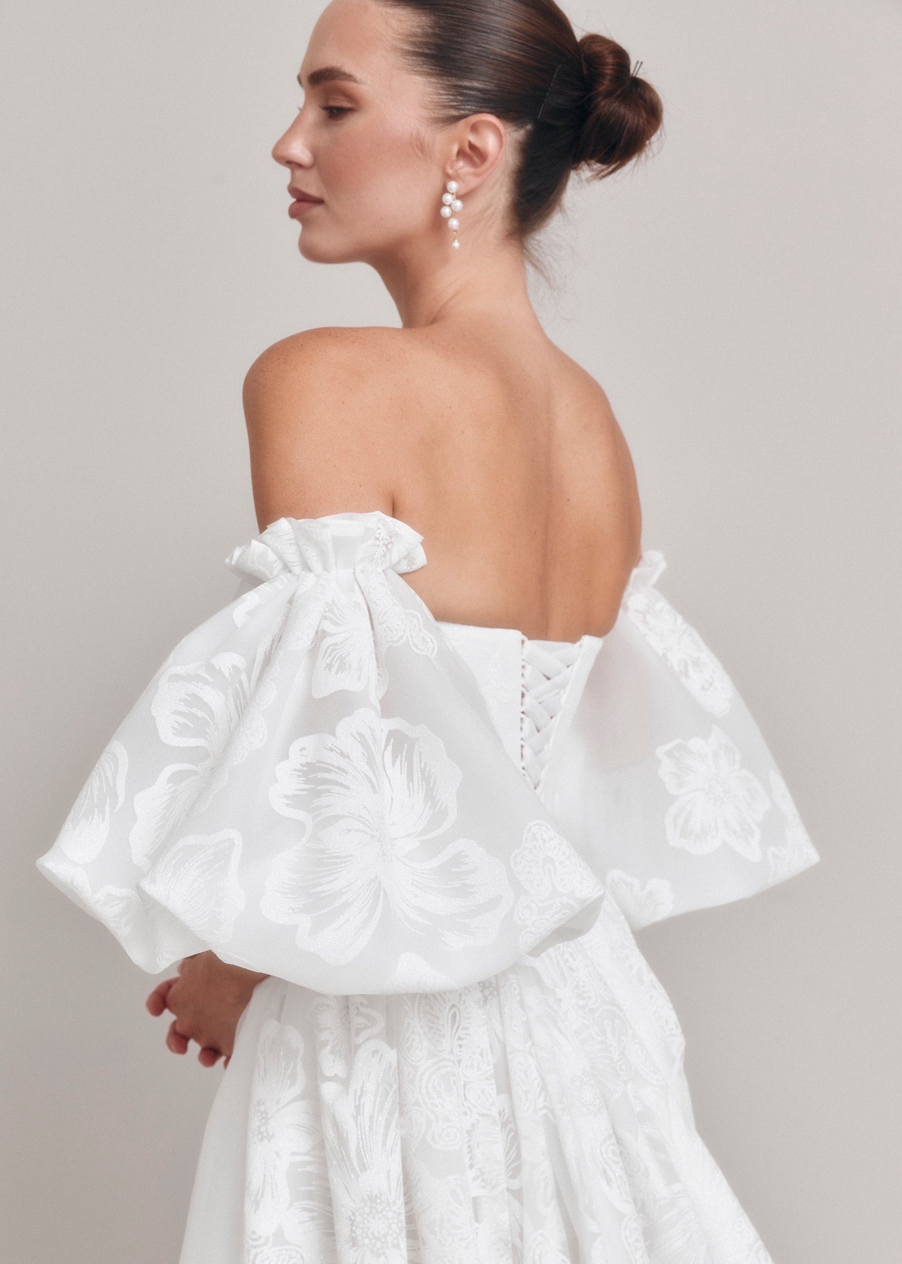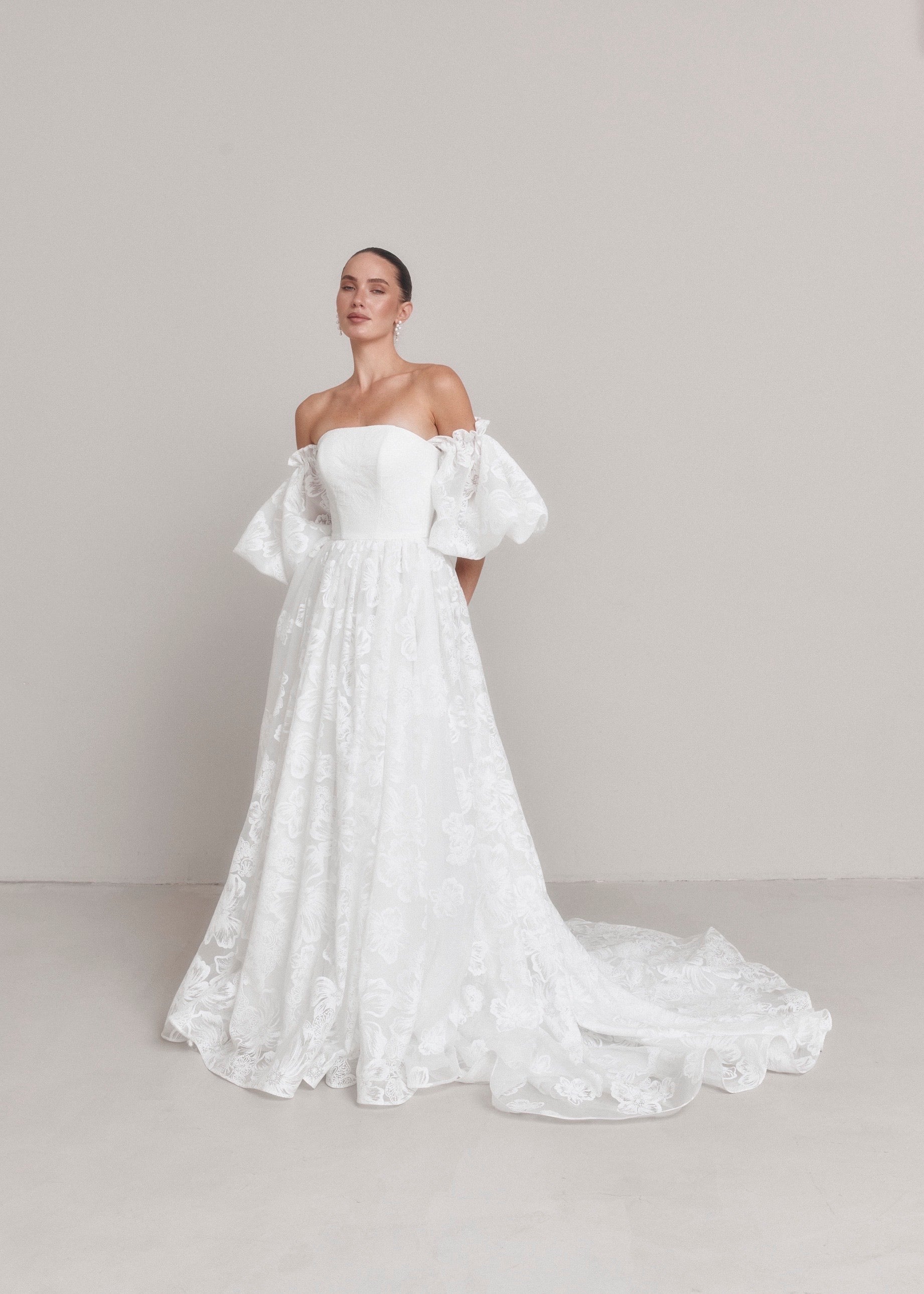 At the heart of the Annabelle lies a meticulously designed corset, its silhouette sculpting your figure into a vision of grace, while the lace-up back ensures a fit so perfect, it feels like a second skin. But the magic doesn't stop there. Imagine draping your shoulders with puffy, detachable sleeves, an ode to romantic tales of yore, yet utterly in tune with today's bridal trends.