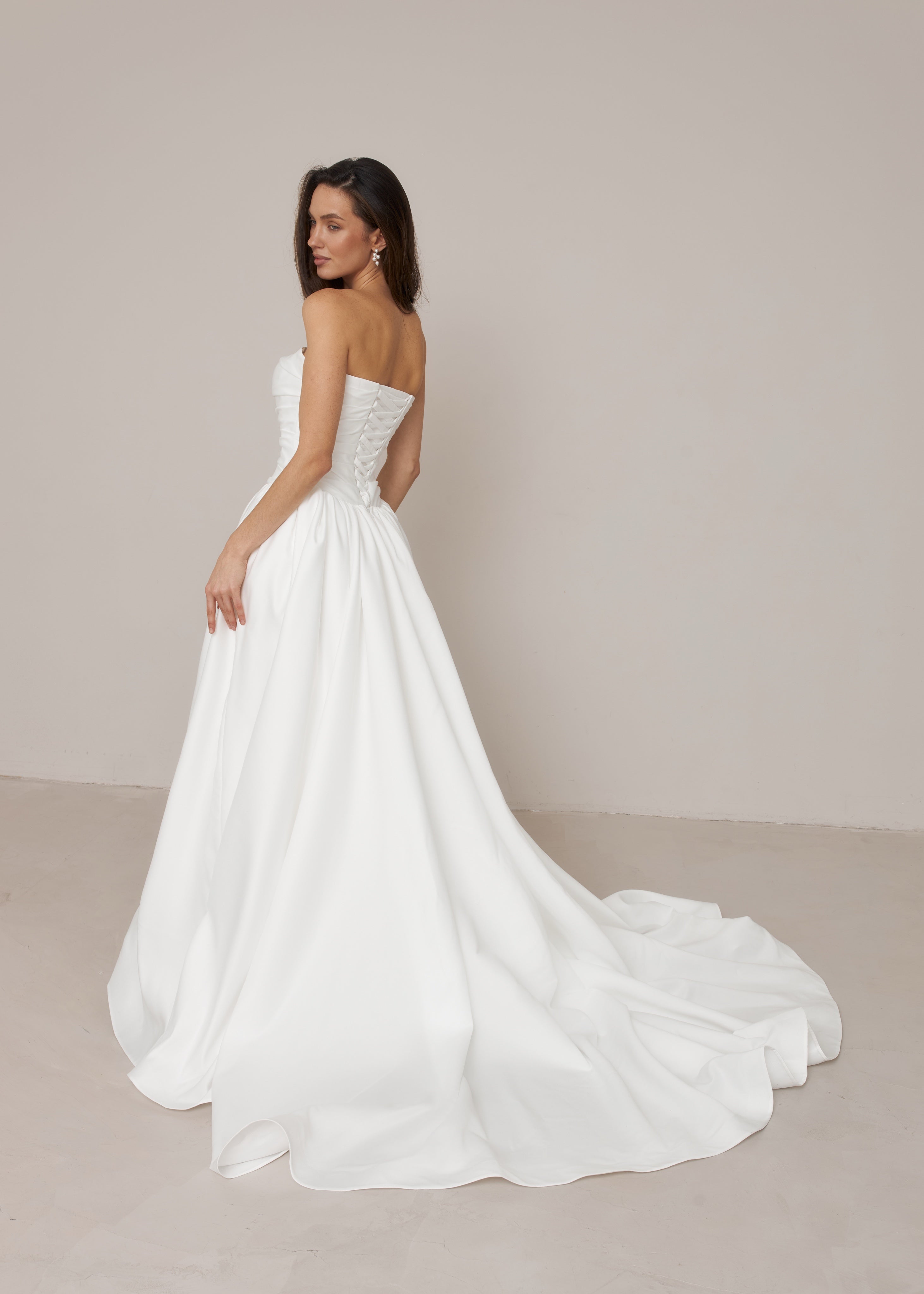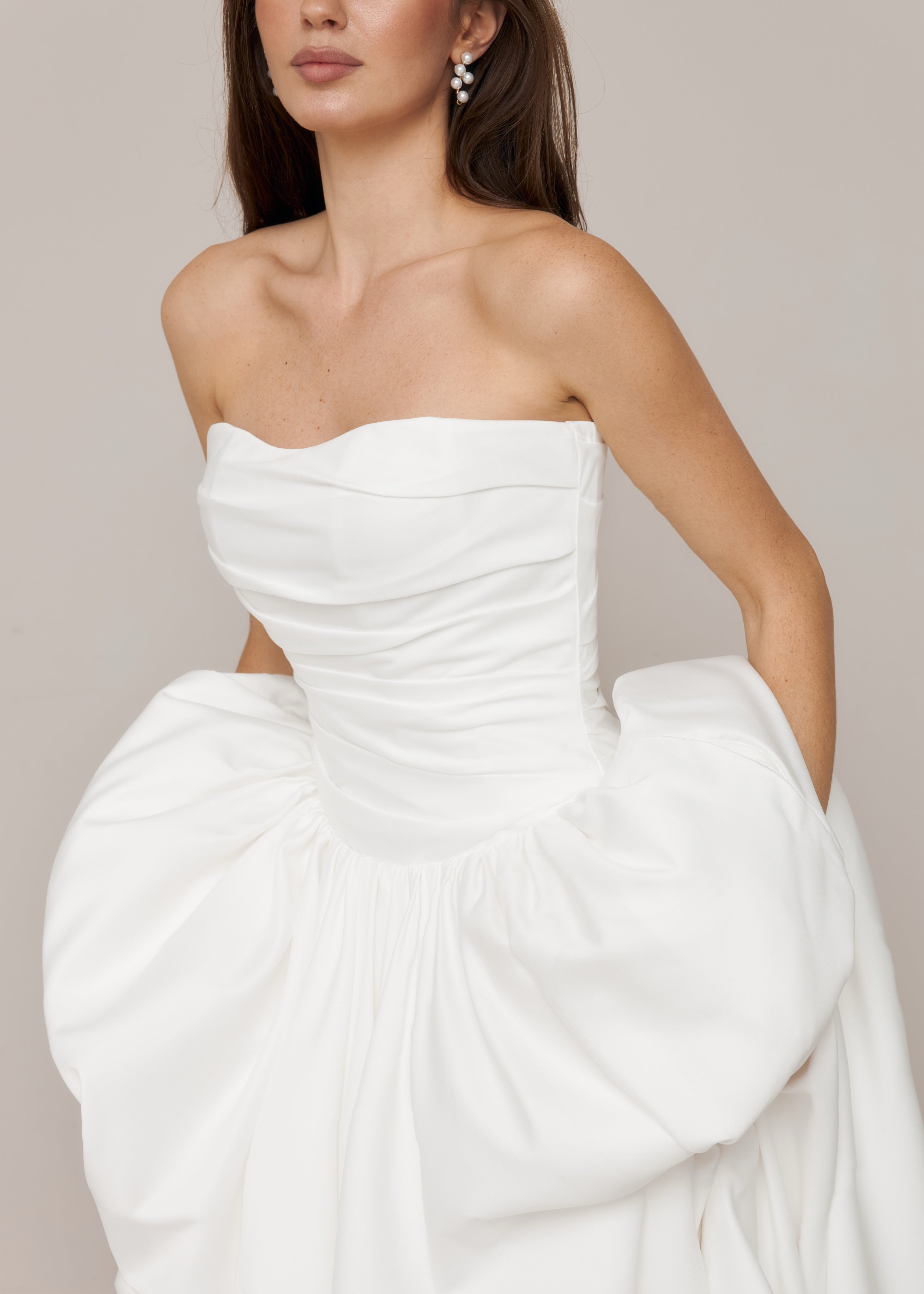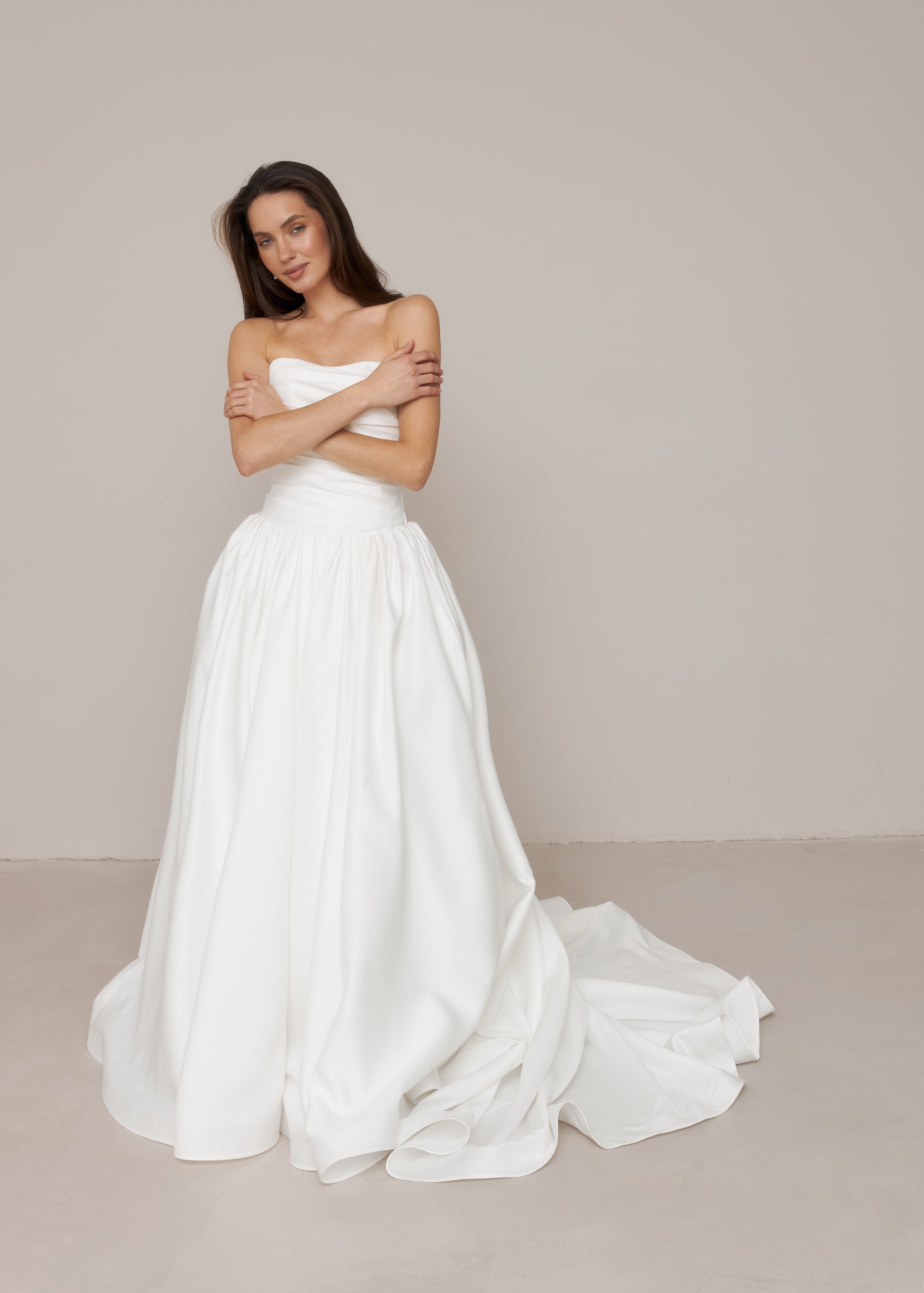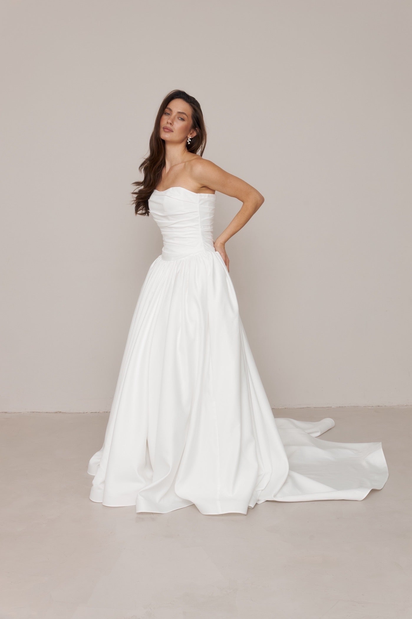 This long satin wedding dress features a fully hand-draped corset with a dropped waist, creating a structured and elongated silhouette. Each dress is individually draped and made by hand in our studio, with all corset draping carefully shaped by our artisans.