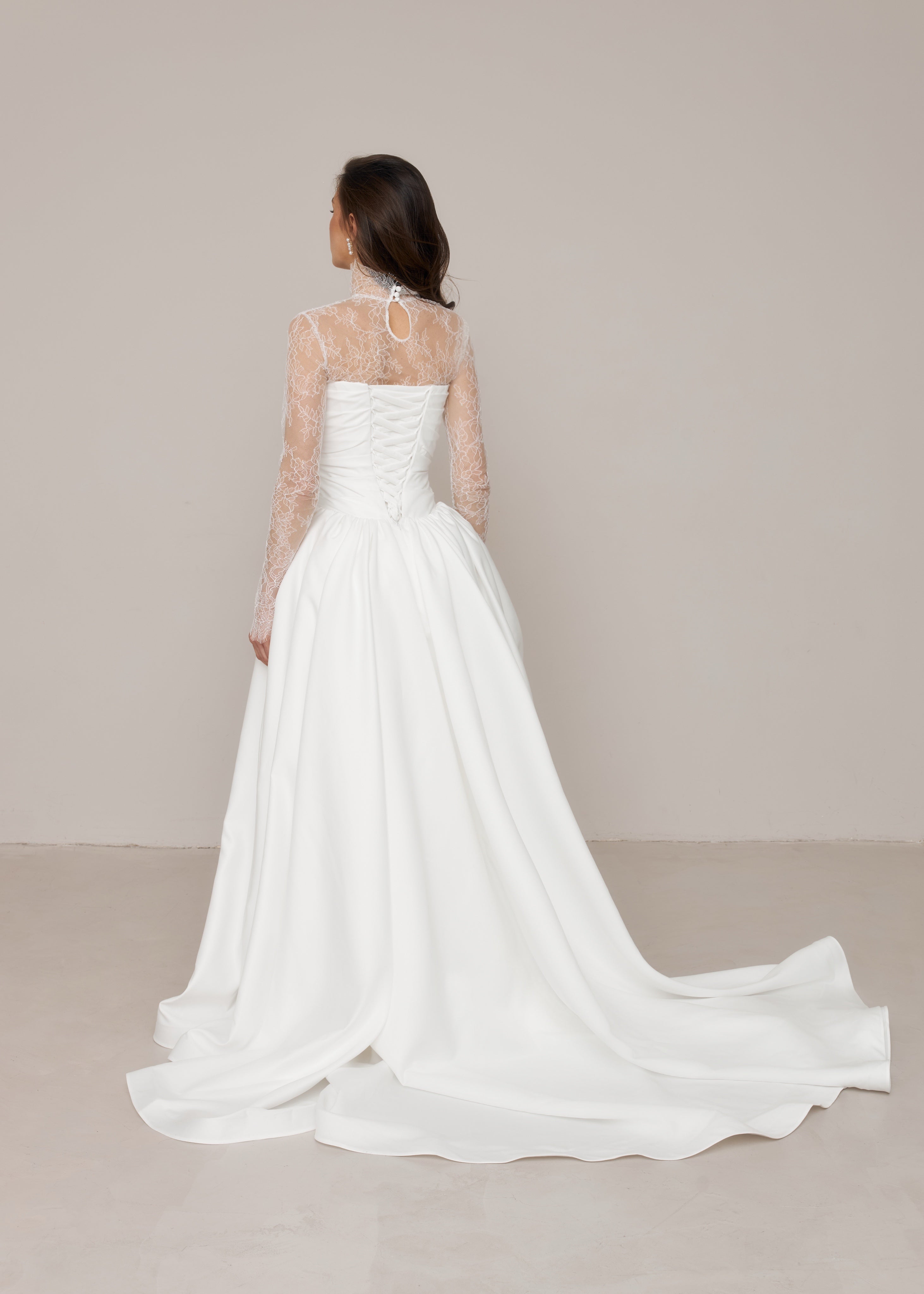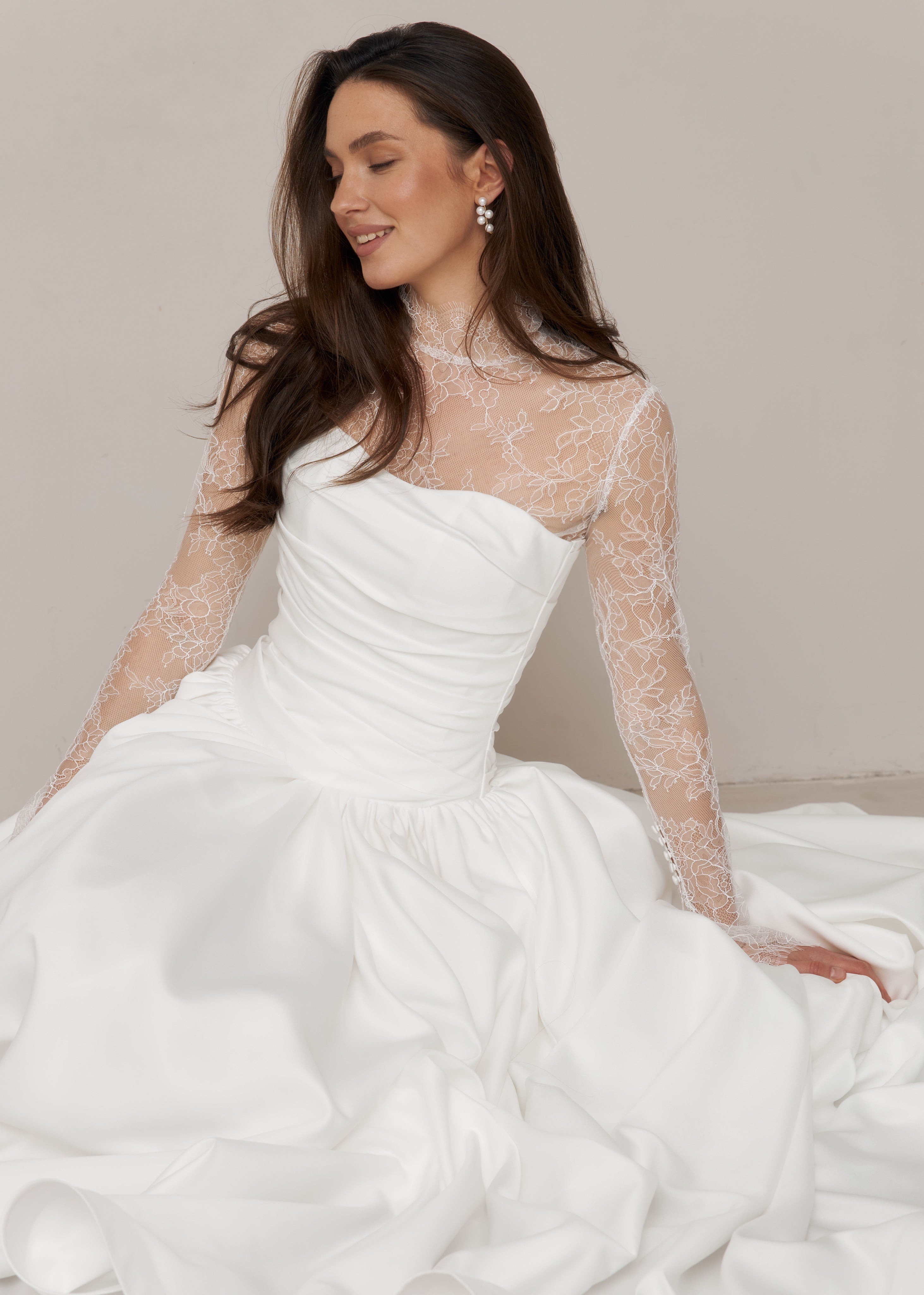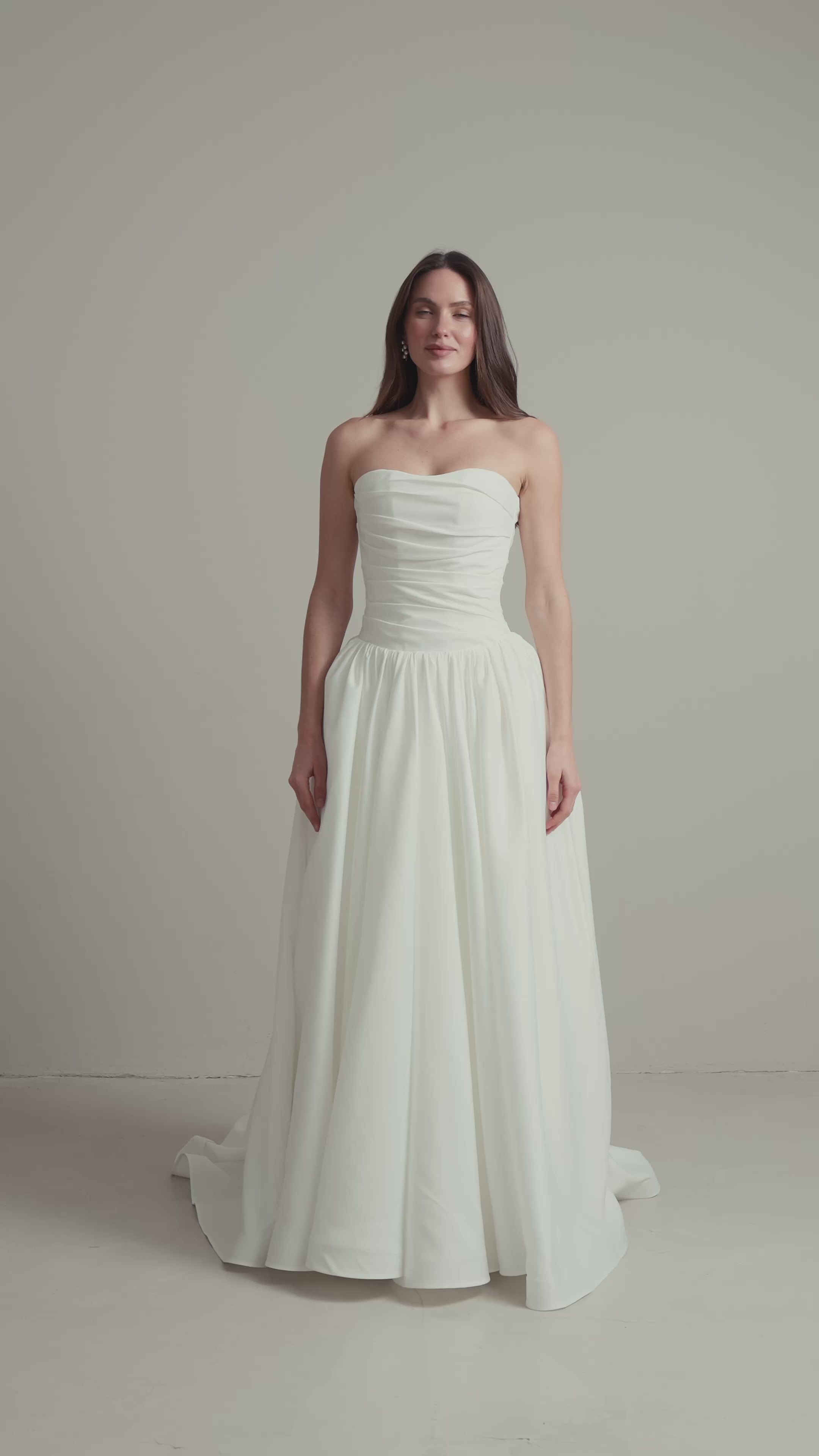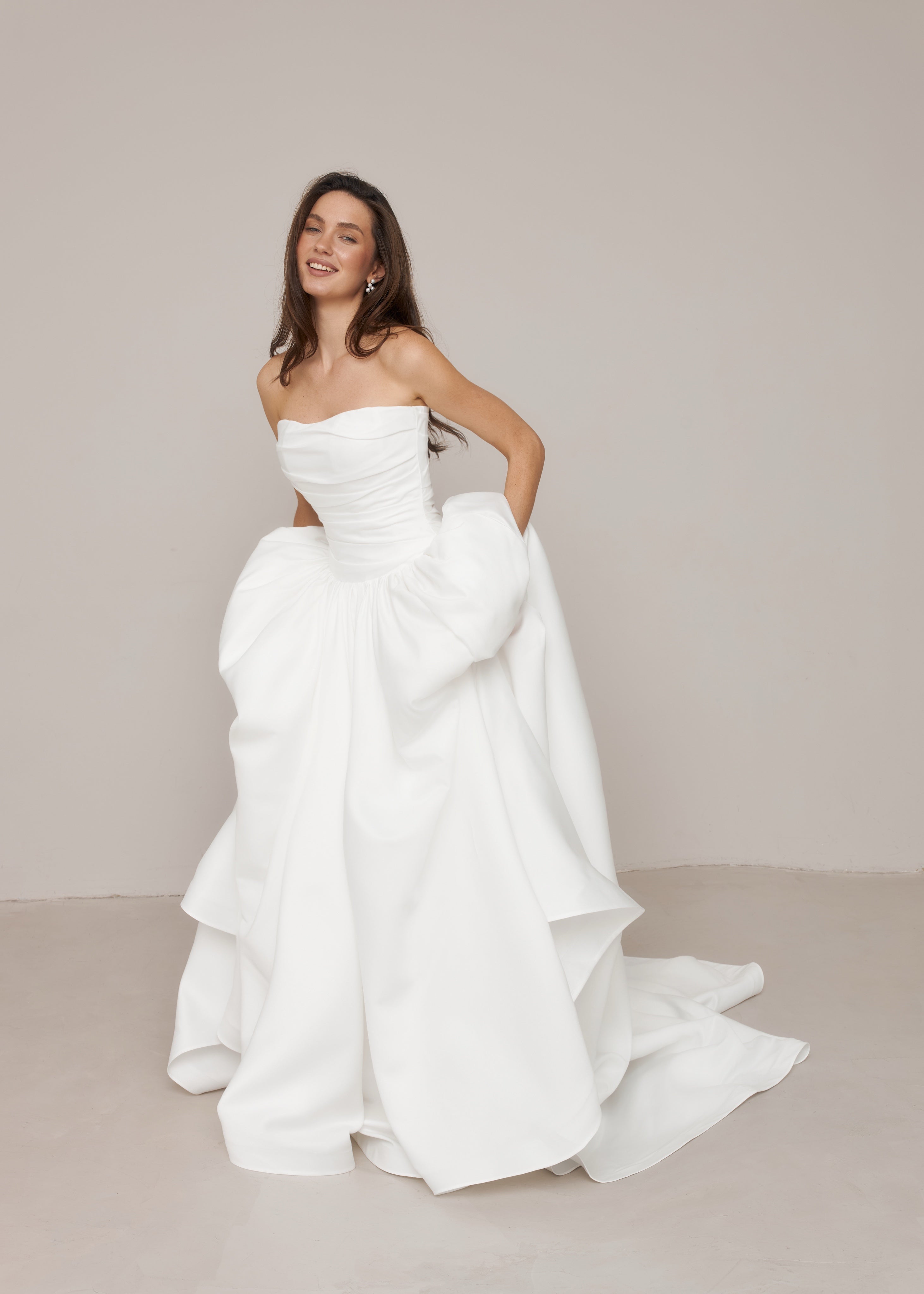 This long satin wedding dress features a fully hand-draped corset with a dropped waist, creating a structured and elongated silhouette. Each dress is individually draped and made by hand in our studio, with all corset draping carefully shaped by our artisans.