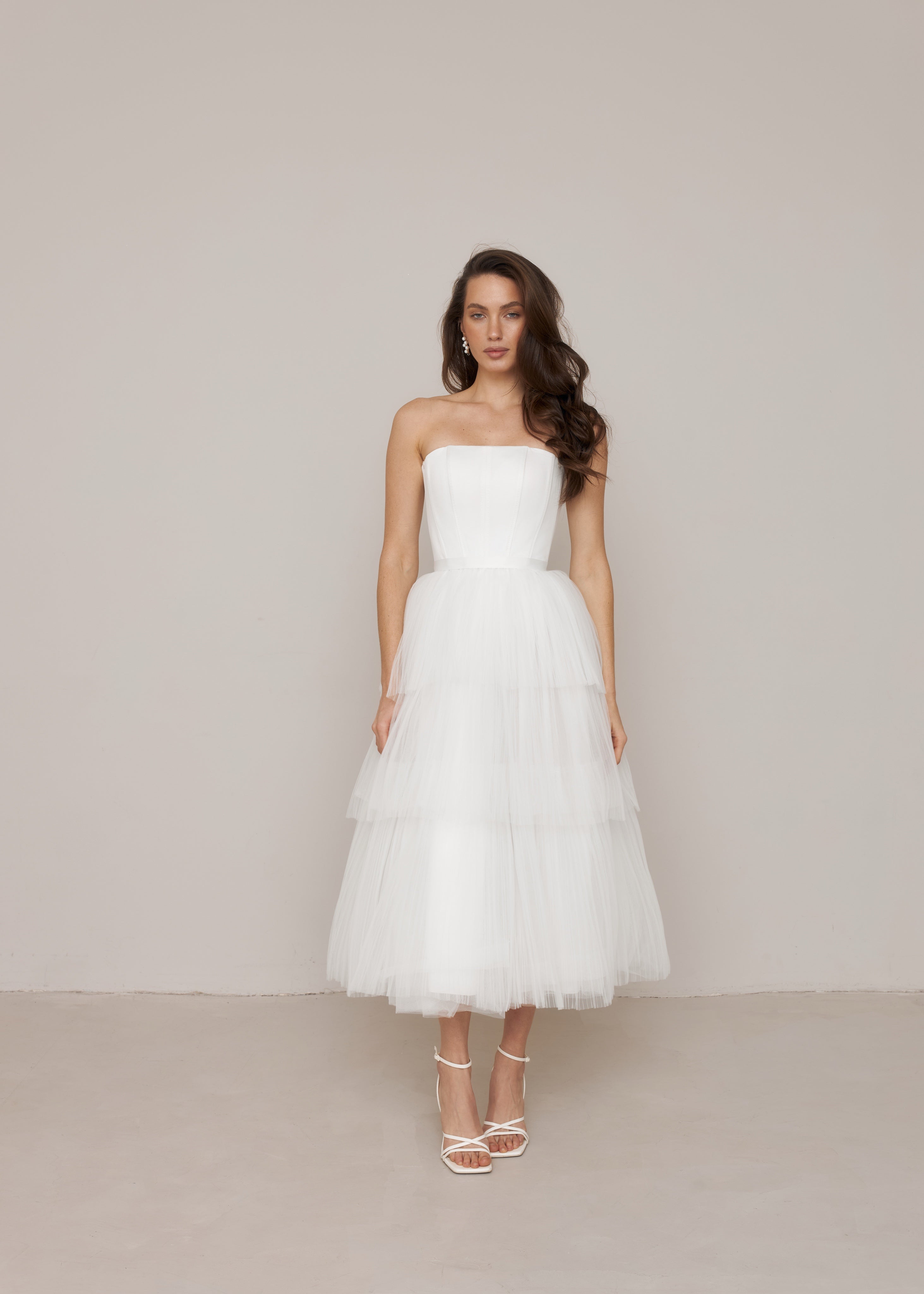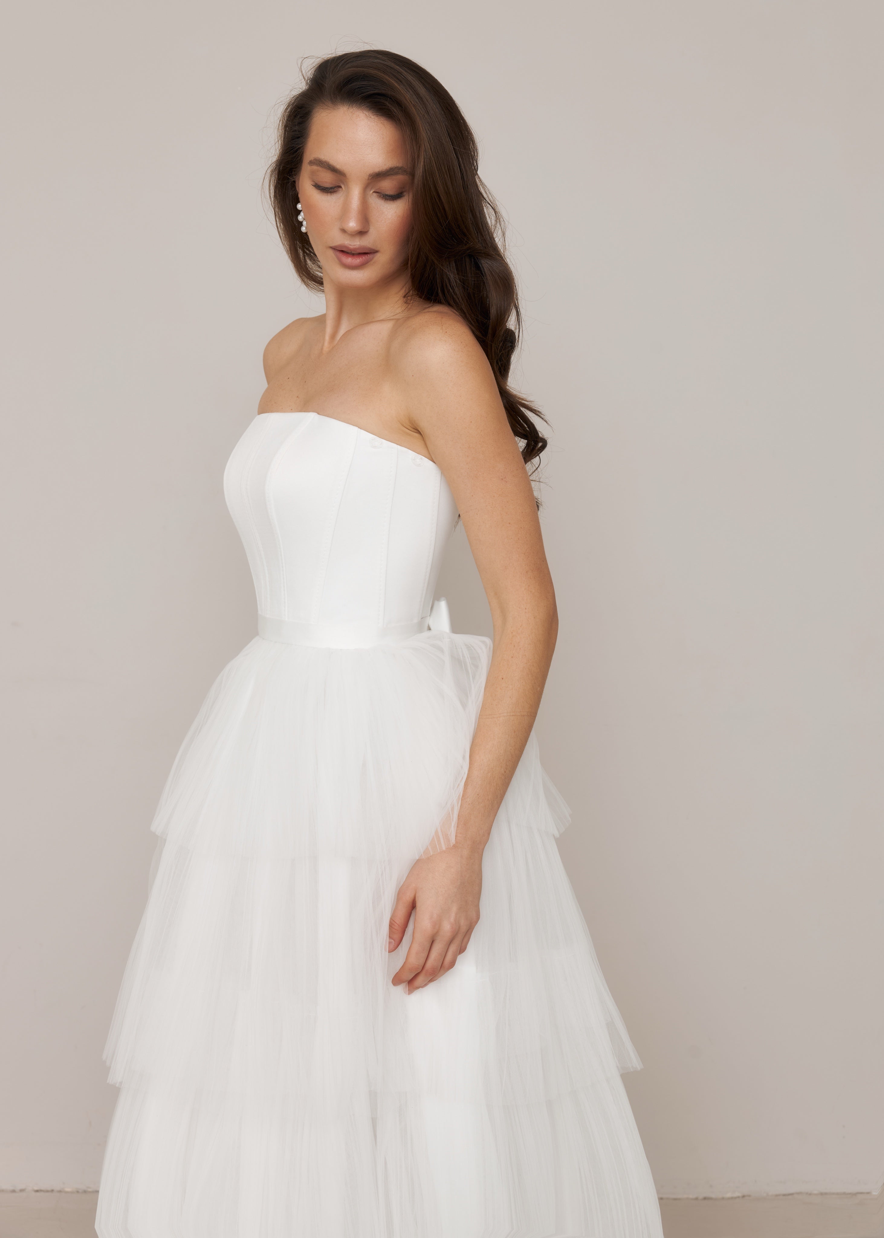 This elegant midi length wedding dress features a satin corset with boning and built-in cups, finished with a charming lace-up back and a delicate bow. The skirt is crafted from pleated tulle with three layers, adding volume and movement. Perfect for the stylish bride seeking a modern look. Pair it with our Scarlett long sleeves for an added touch of sophistication.
