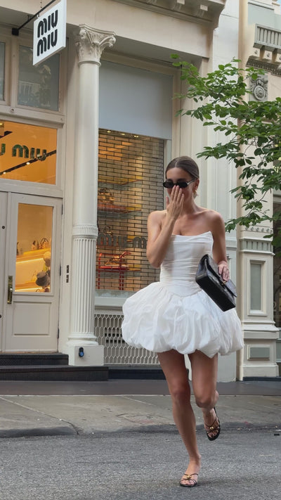 The balloon-style skirt is made of matching taffeta, known for its signature memory effect — giving the look volume and elegance. The skirt also features discreet side pockets, adding both comfort and modern flair.