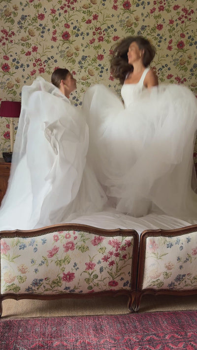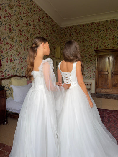 The structured satin corset features a modern basque waistline and a classic lace-up back, offering both style and adjustable fit. Built-in cups and boning provide excellent bust support and ensure a flattering, secure fit throughout the day. The voluminous skirt is crafted from soft tulle, creating an ethereal silhouette that flows into a delicate train.