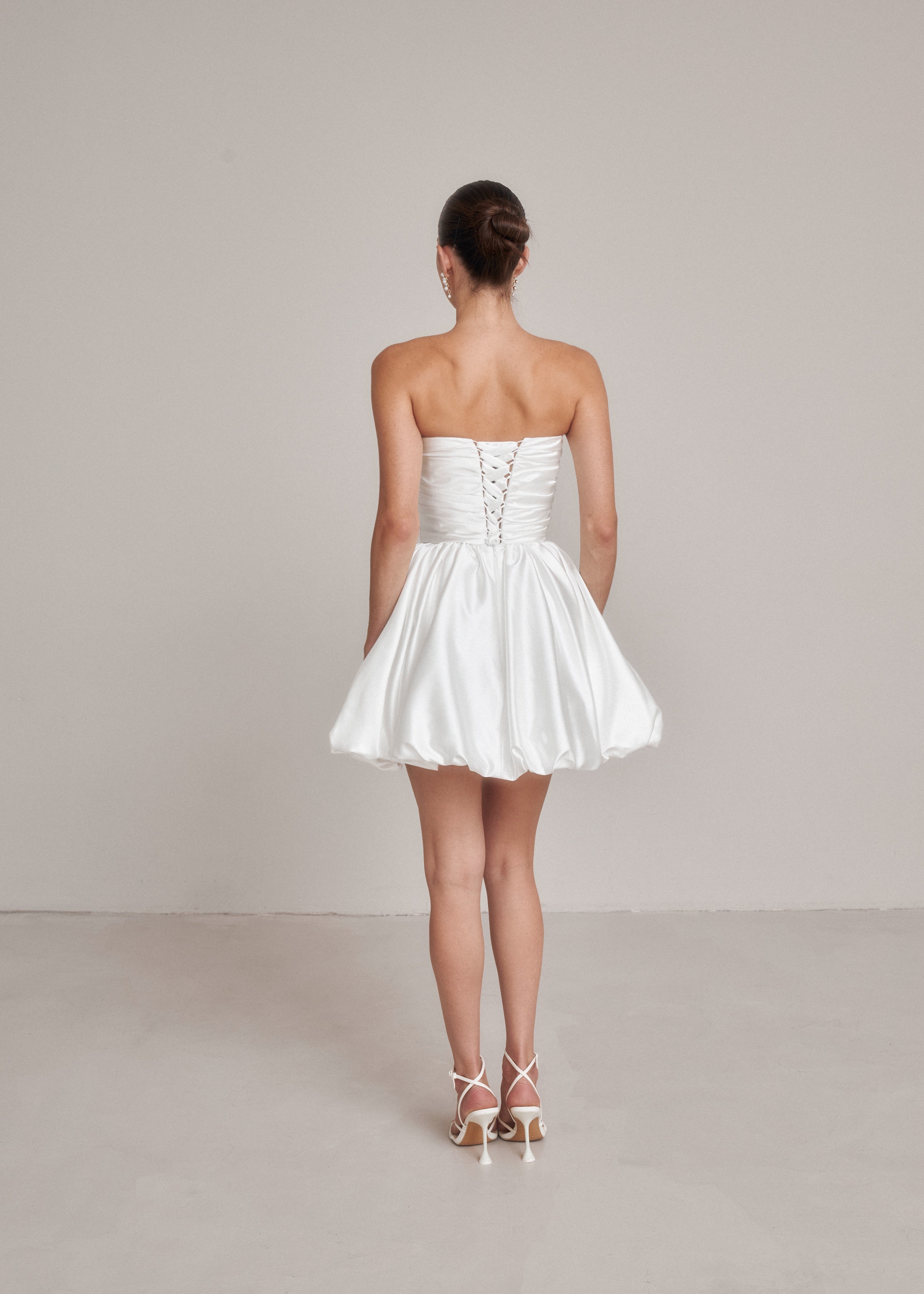 This short wedding dress features a romantic balloon skirt and a beautifully hand-draped satin corset. The back is finished with a lace-up closure, allowing for easy size adjustments and a perfect fit.