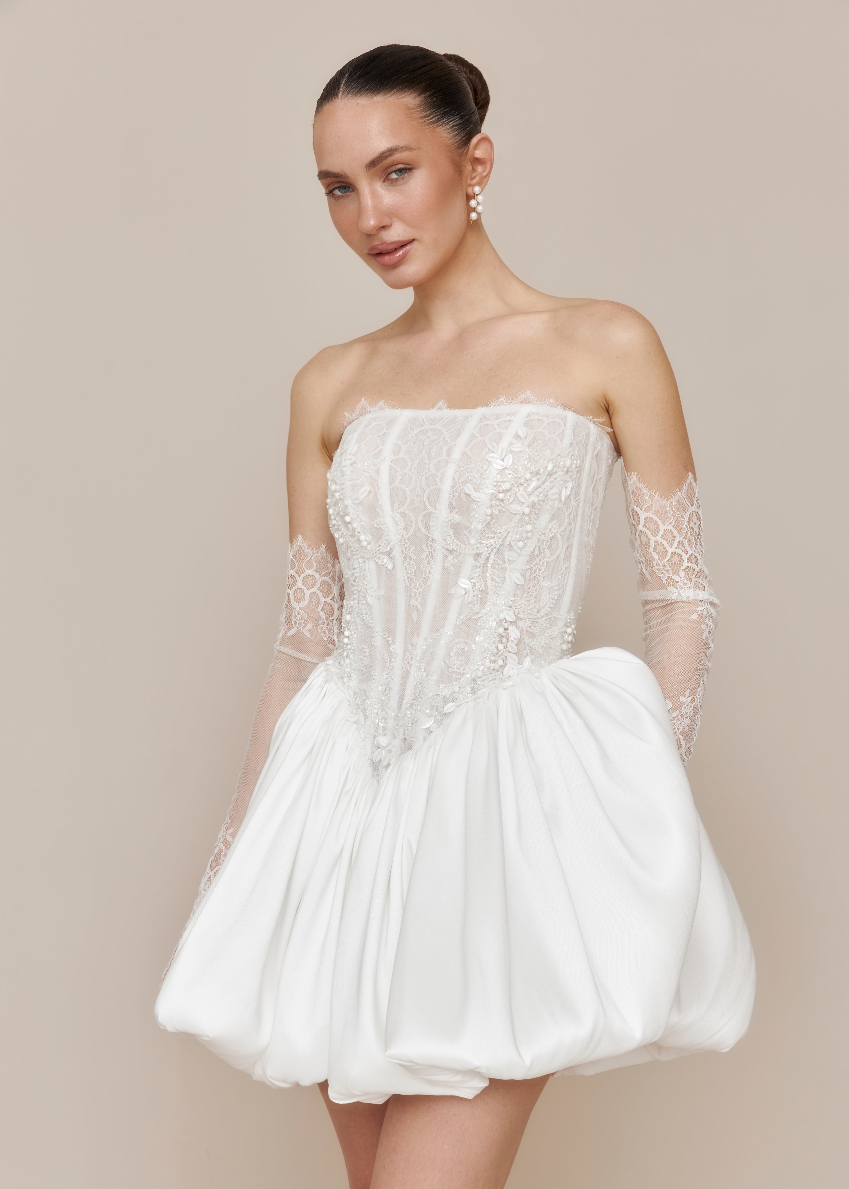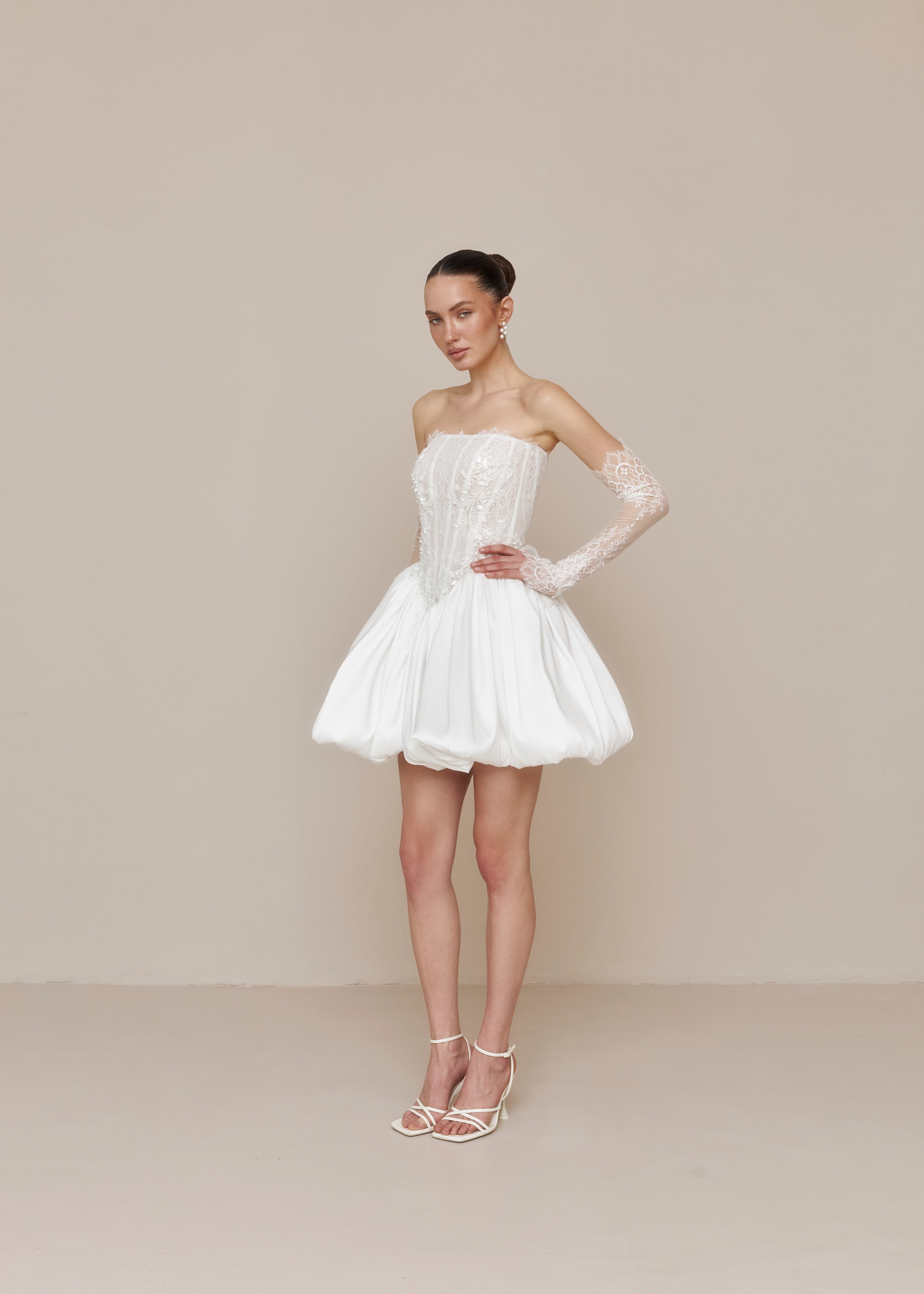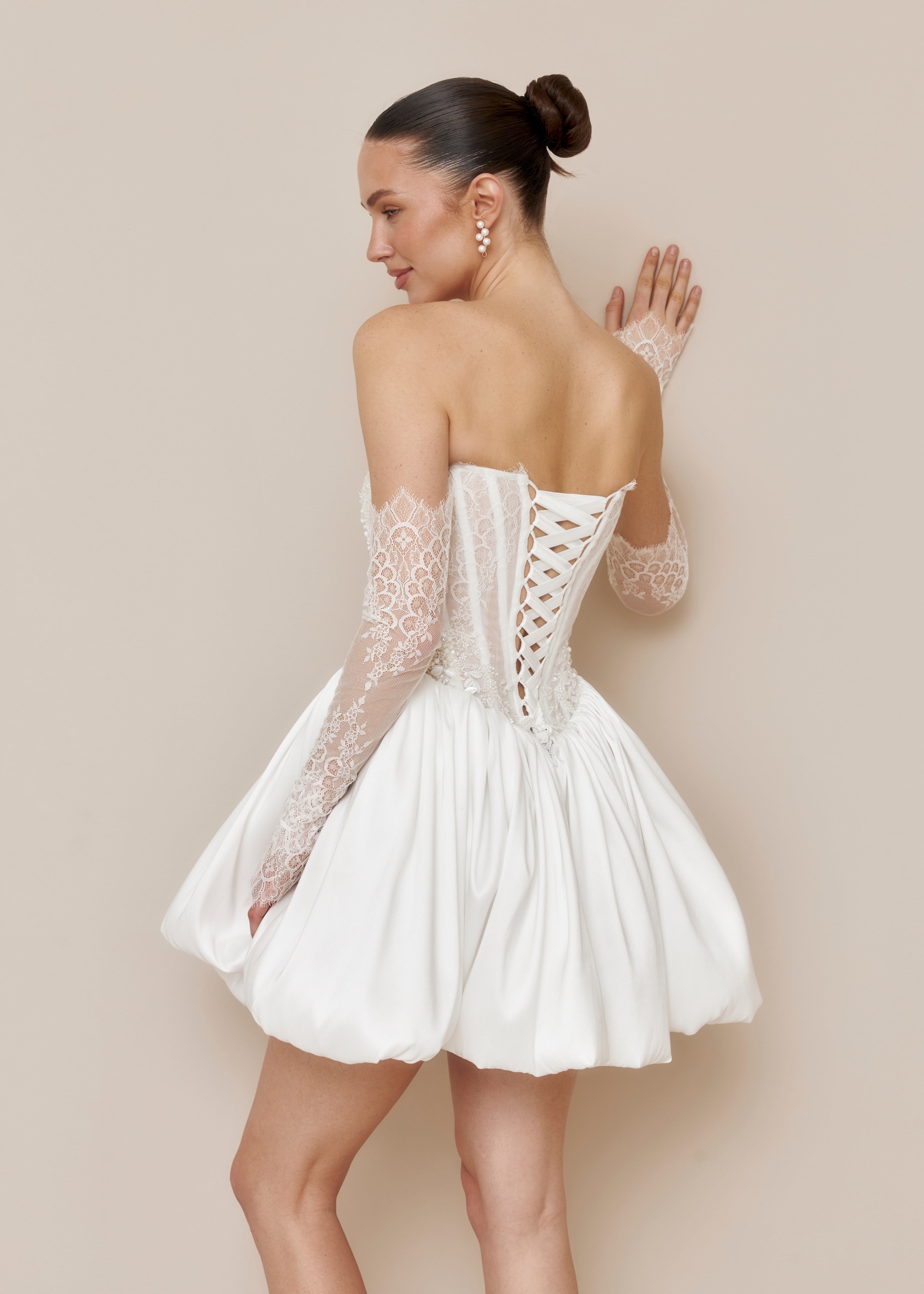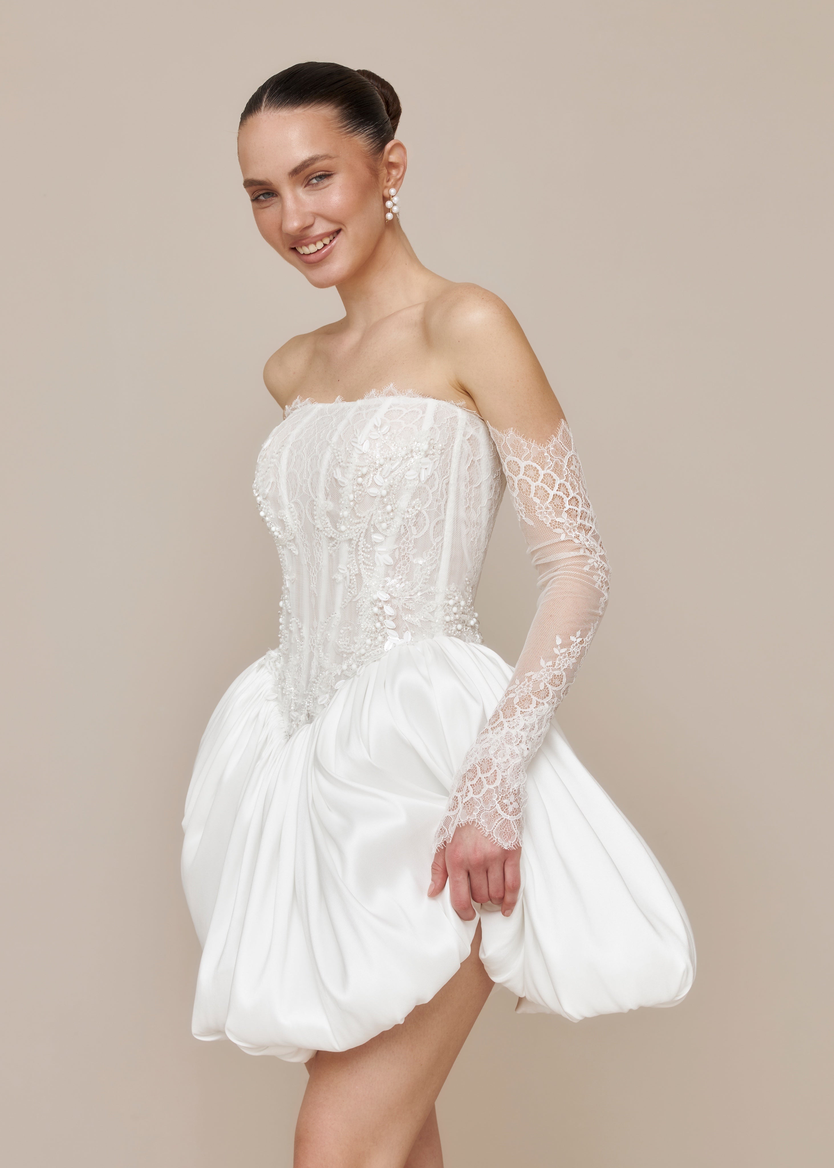 This modern short wedding dress exudes contemporary charm and timeless sophistication. The corset is crafted from delicate Chantilly lace, adorned with exquisite hand-embroidered beadwork and pearls for a luxurious touch. The playful balloon skirt, made from structured Mikado fabric, beautifully complements the corset while maintaining its flawless shape. A stunning lace-up back that adds a touch of elegance and adjustable comfort. Perfect for brides seeking a stylish and unique look for their special day.