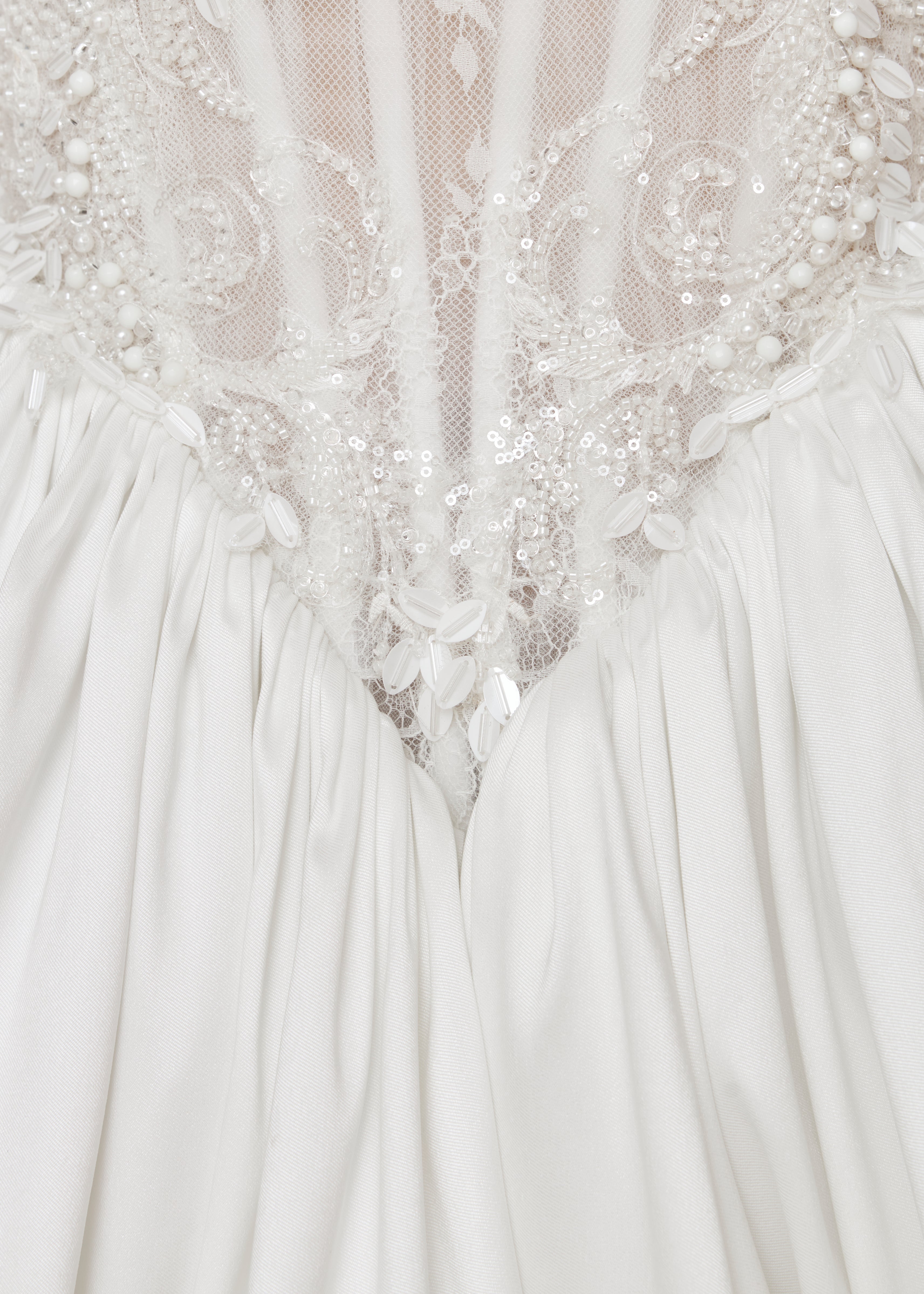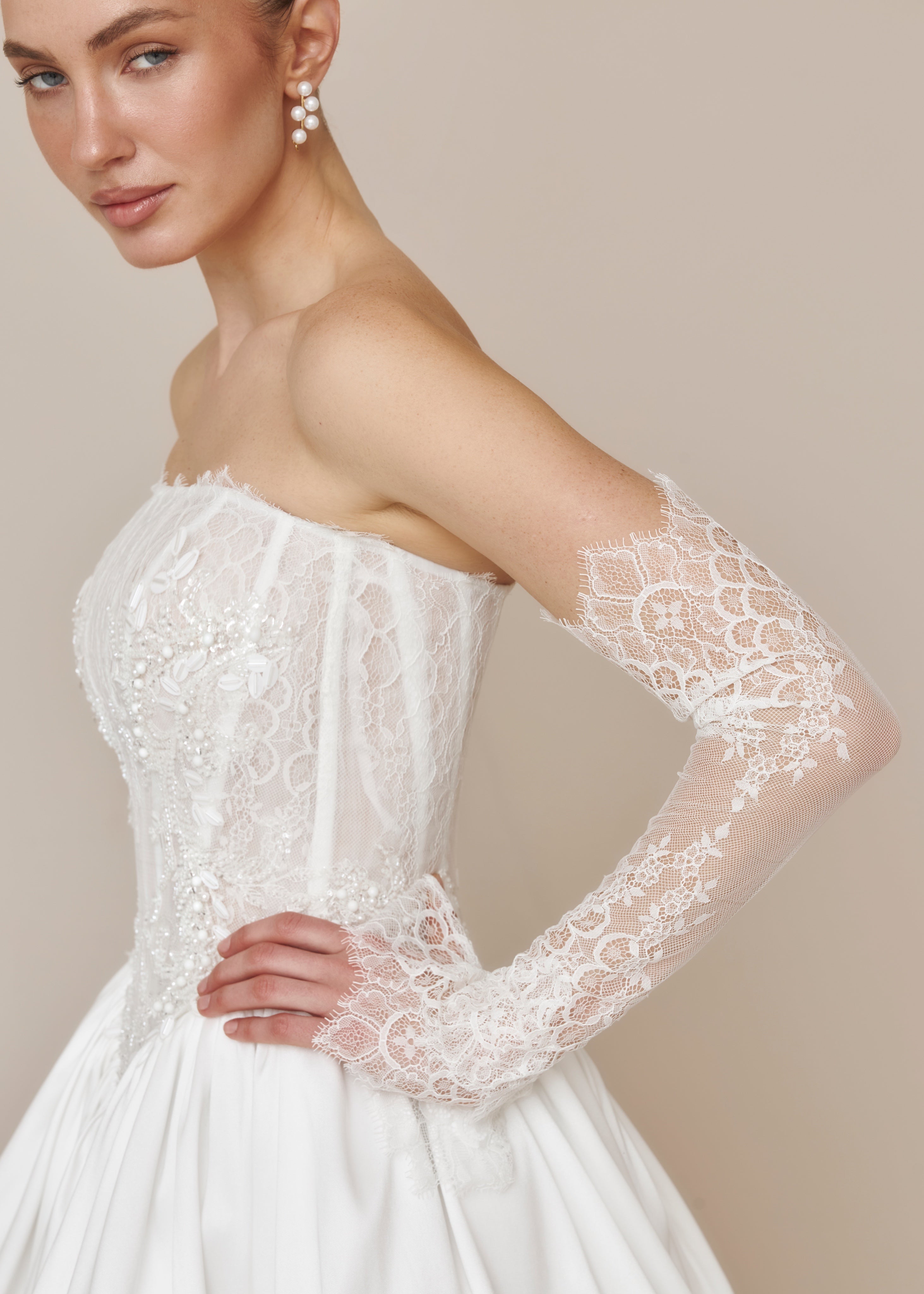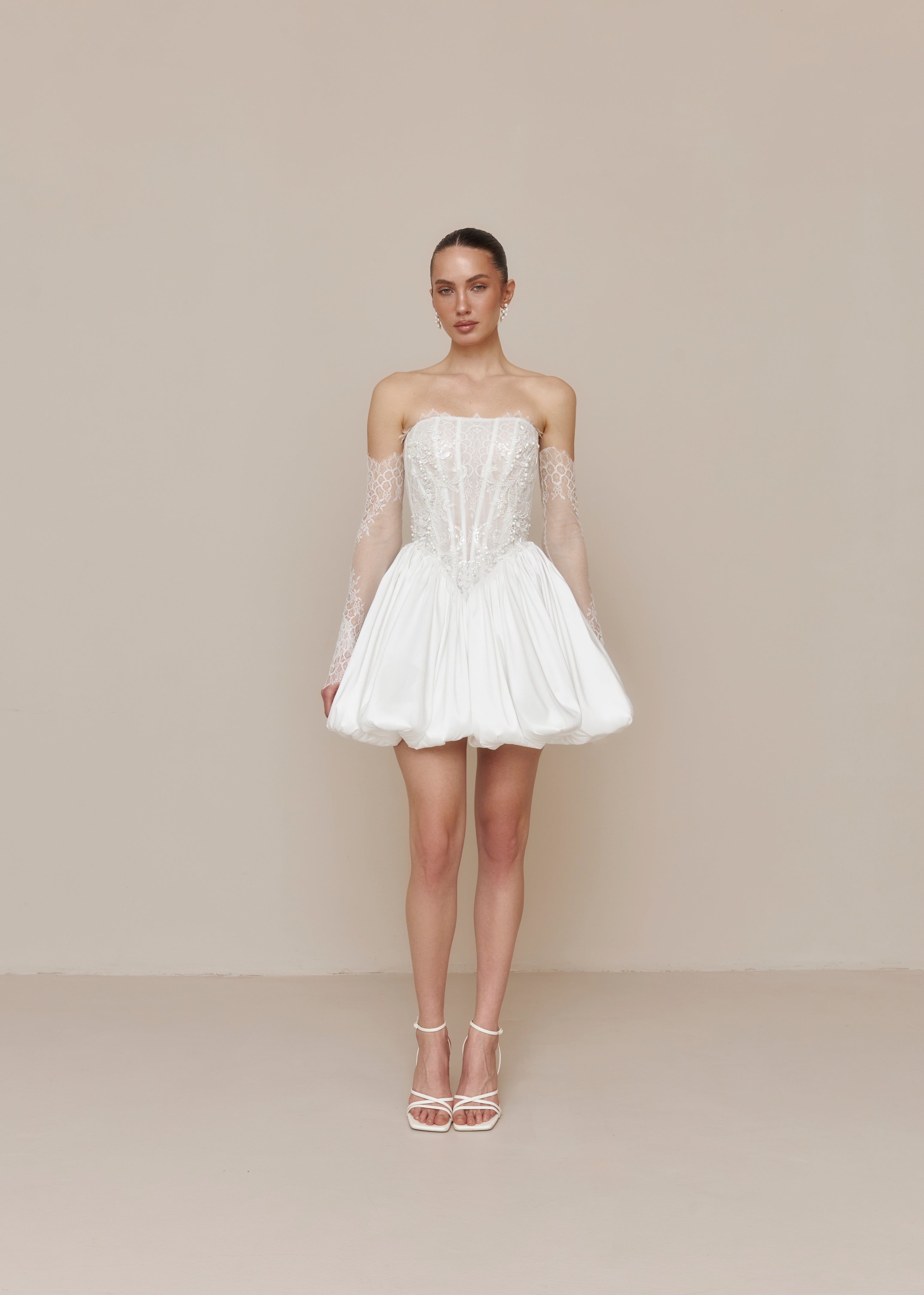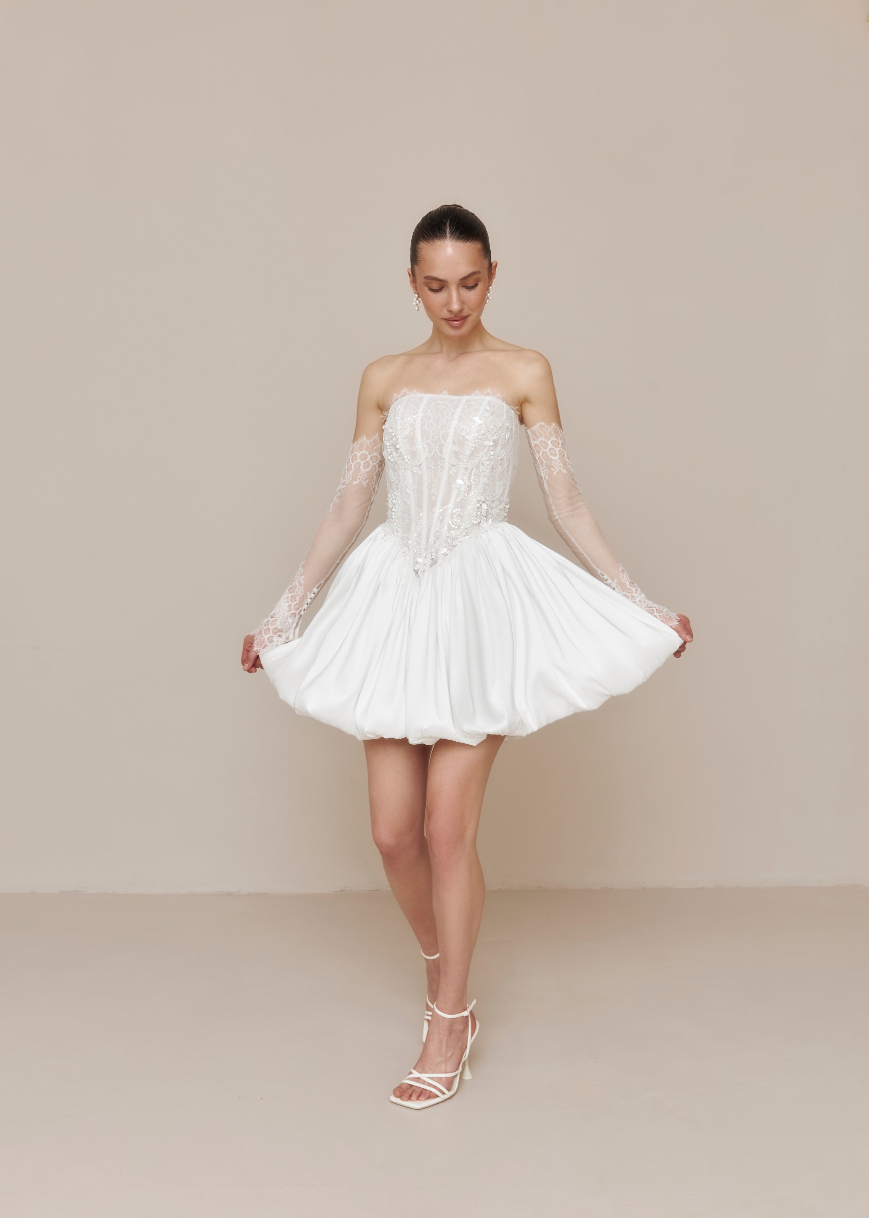 This modern short wedding dress exudes contemporary charm and timeless sophistication. The corset is crafted from delicate Chantilly lace, adorned with exquisite hand-embroidered beadwork and pearls for a luxurious touch. The playful balloon skirt, made from structured Mikado fabric, beautifully complements the corset while maintaining its flawless shape. A stunning lace-up back that adds a touch of elegance and adjustable comfort. Perfect for brides seeking a stylish and unique look for their special day.