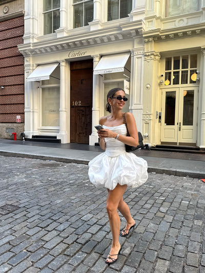 This fashion-forward ensemble is perfect for a bridal shower, rehearsal dinner, elopement or summer wedding.