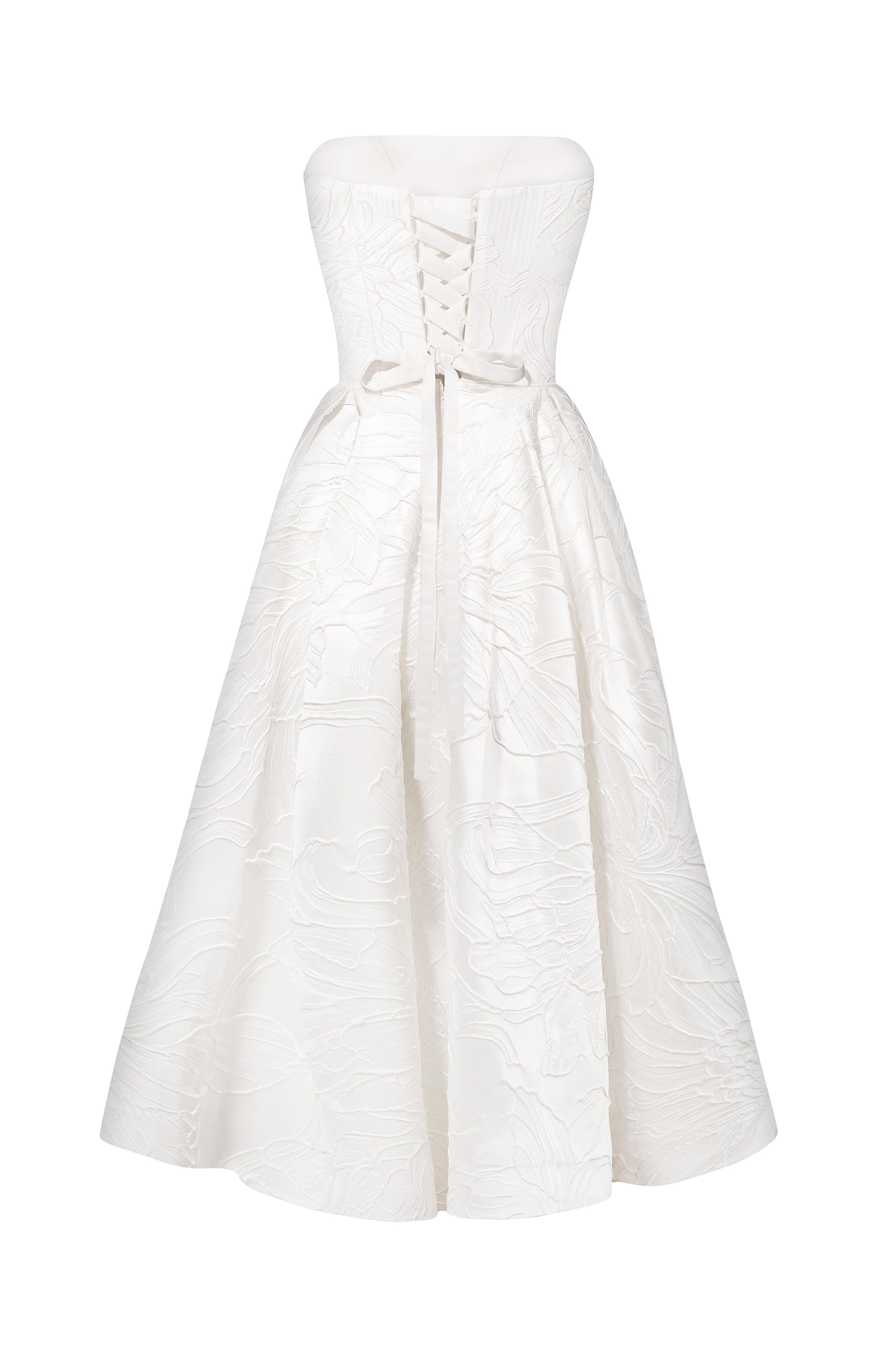 With a timeless tea-length or midi silhouette, the softly voluminous skirt creates a graceful shape, while the structured bodice features built-in cups and boning for comfort and support. The adjustable lace-up back ensures a perfect fit, and discreet side pockets add a modern, practical touch.